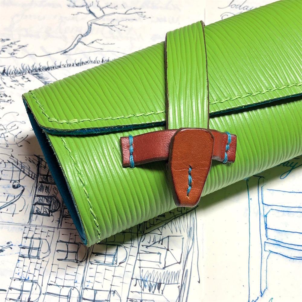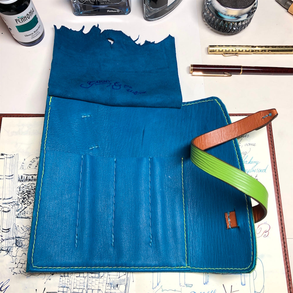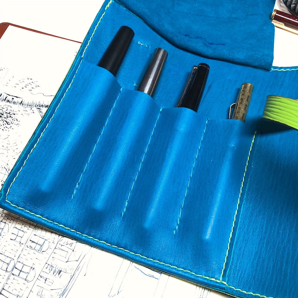 EPI Leather Pen Roll, Pen wrap, Green and Blue for 4 pens