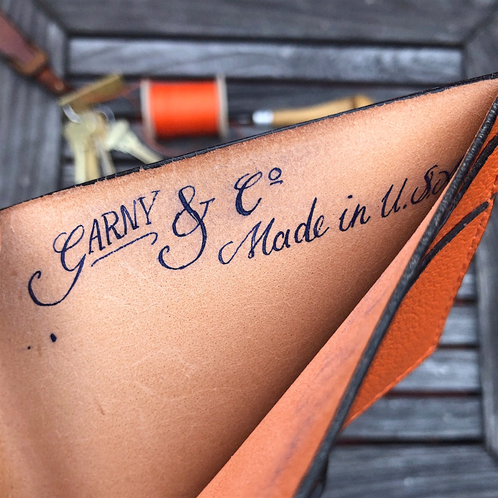 Black vegetable dyed genuine shell cordovan leather outside, orange vegetable dyed goat skin inside. Hand stitched with waxed nylon thread. All edges are coated and polished.