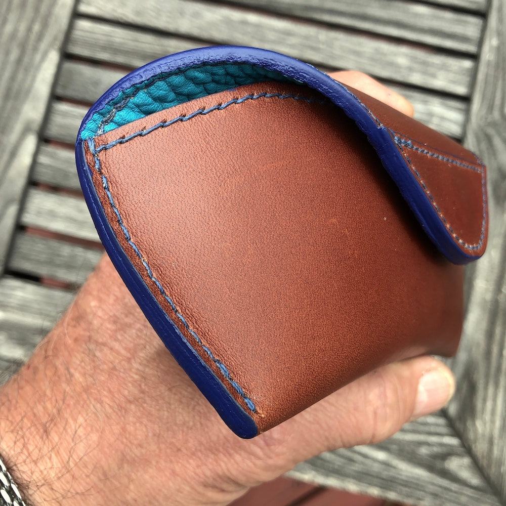 The outside is U.S. sourced vegetable dyed cowhide, inside is deerskin. Hand cut and hand stitched (saddle stitched), heirloom quality. Protection in style at your office, traveling, work and home.