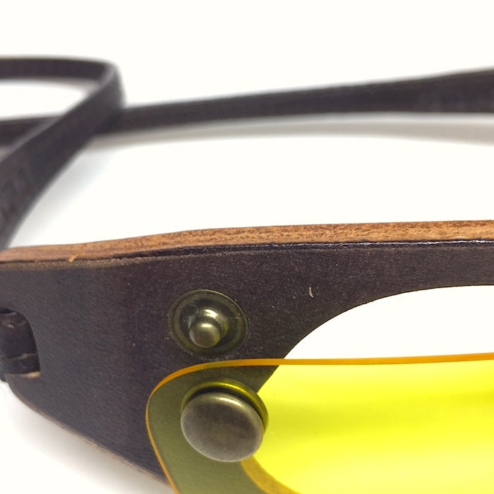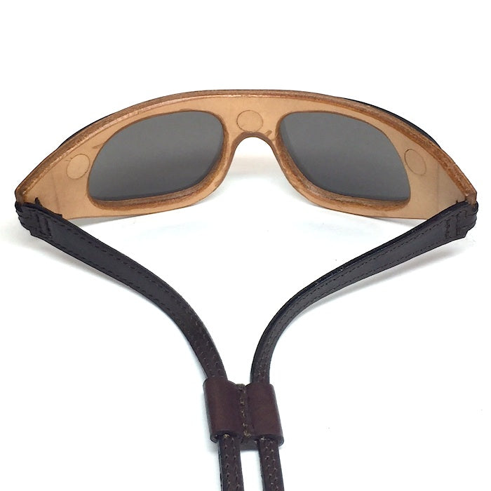 A unique eyewear design, hand crafted from a truly organic material: leather. 100% vegetable dyed leather only. Easy lens changing with brass snaps.