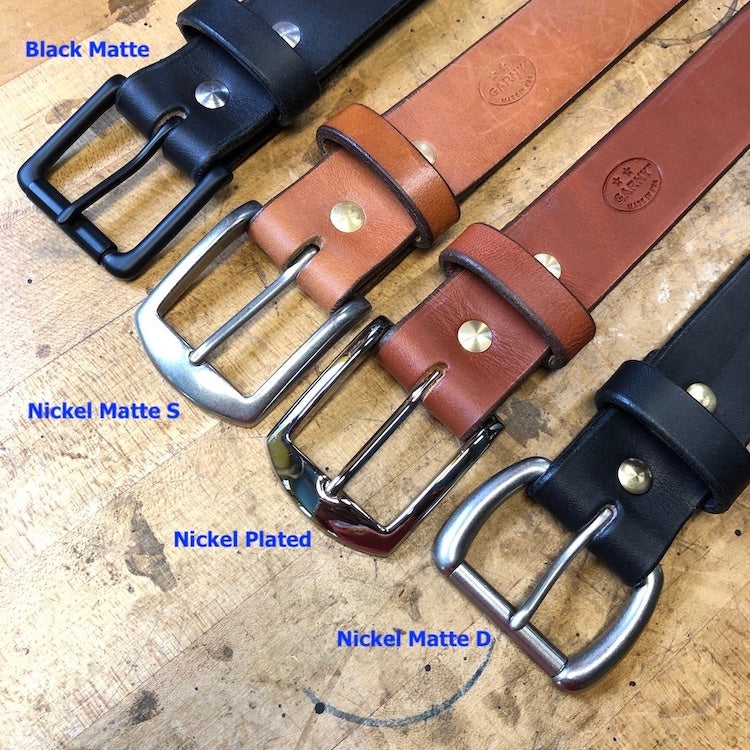 This belt has a solid brass with black matte finished buckle. Belt fastened with Chicago screws for interchangeable buckles if needed.