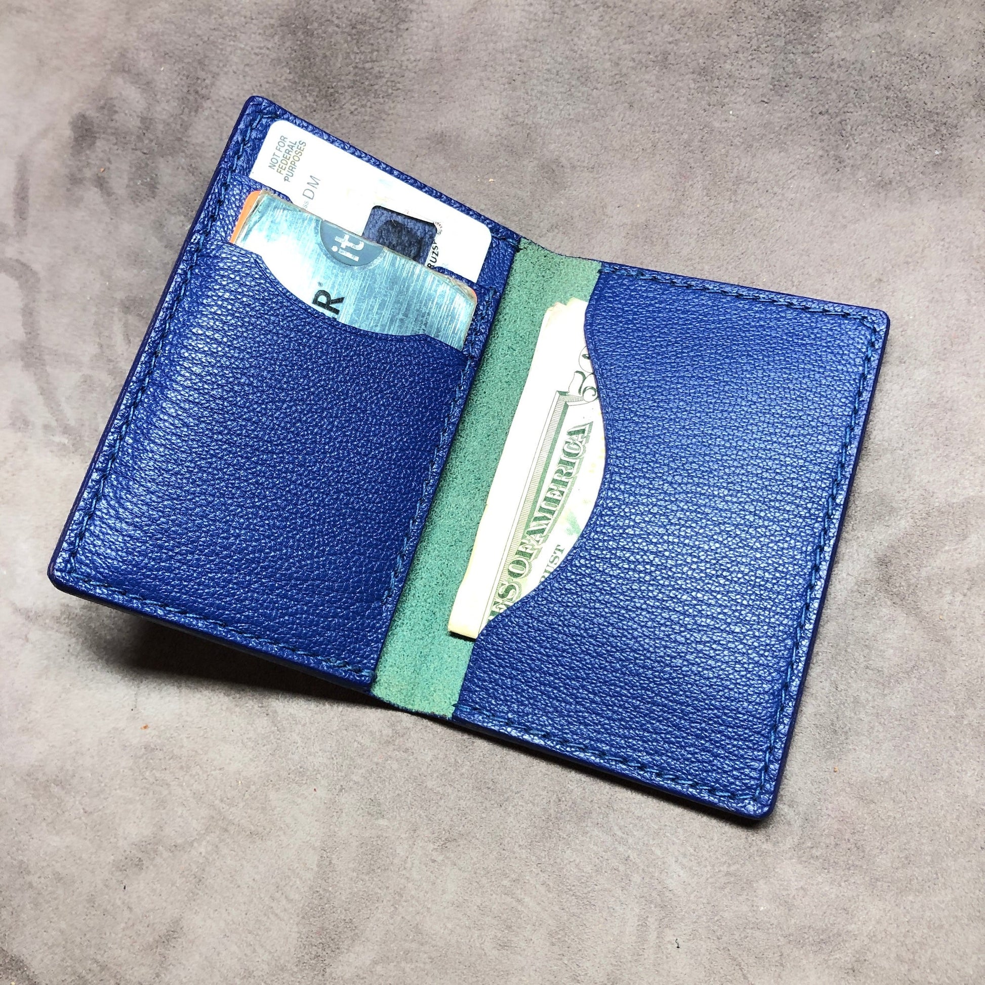 Designed to hold credit cards (about 8-10), driver license and or business cards and folded $ bills. Everyday Carry. Please expect natural markings.