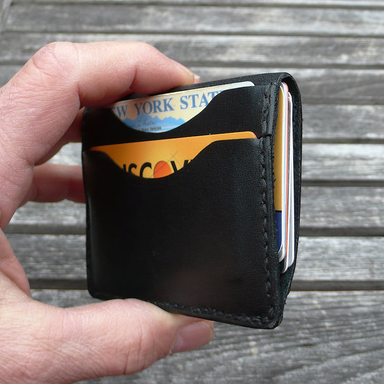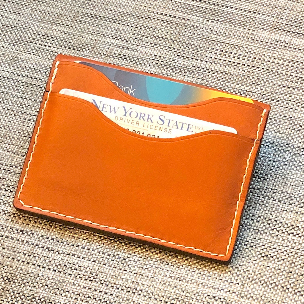Handcrafted from vegetable dyed cowhide. The edge is coated and polished. Perfect fit for any pocket, front or back, tight or loose, without bulk. It will hold credit cards, drivers license etc. in 4 compartments: 2 card pockets on front , 1 pocket for $ bills on the back and more storage in the middle to hold about 12 credit cards.