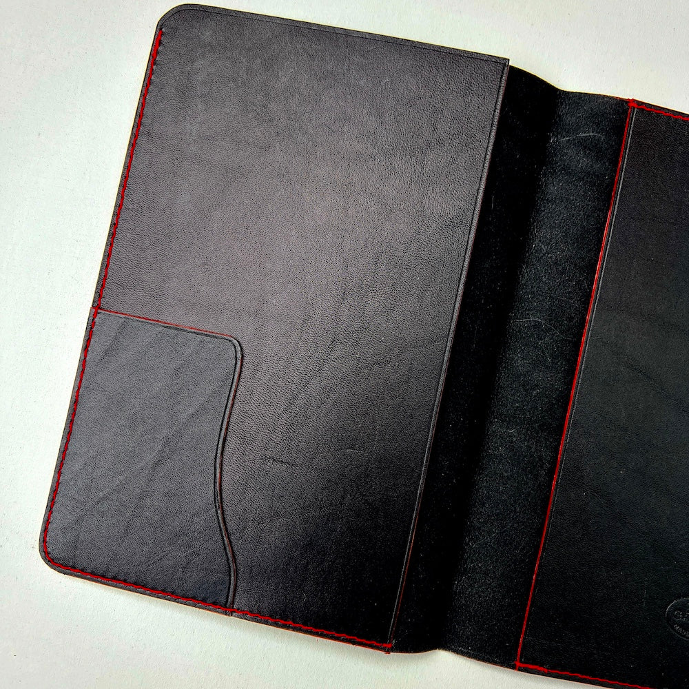 Outside cover and inside pockets are made of full grain vegetable tanned leather. Please expect natural markings.
