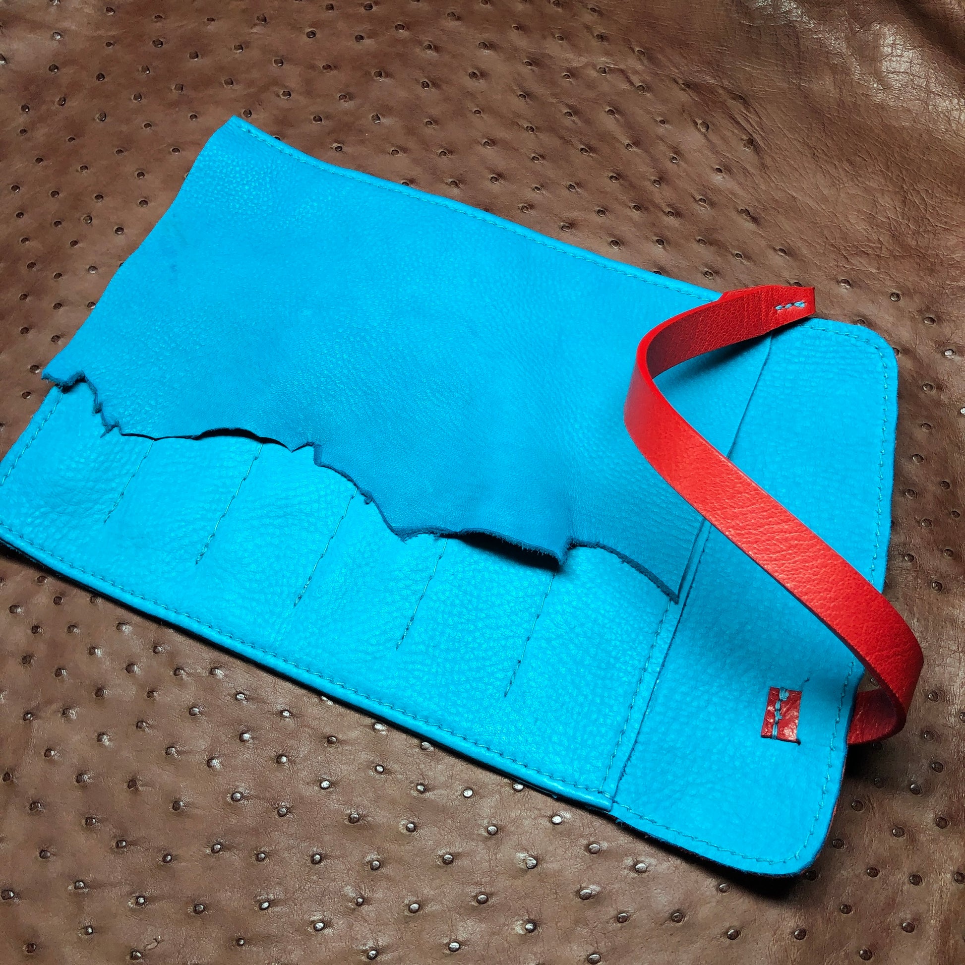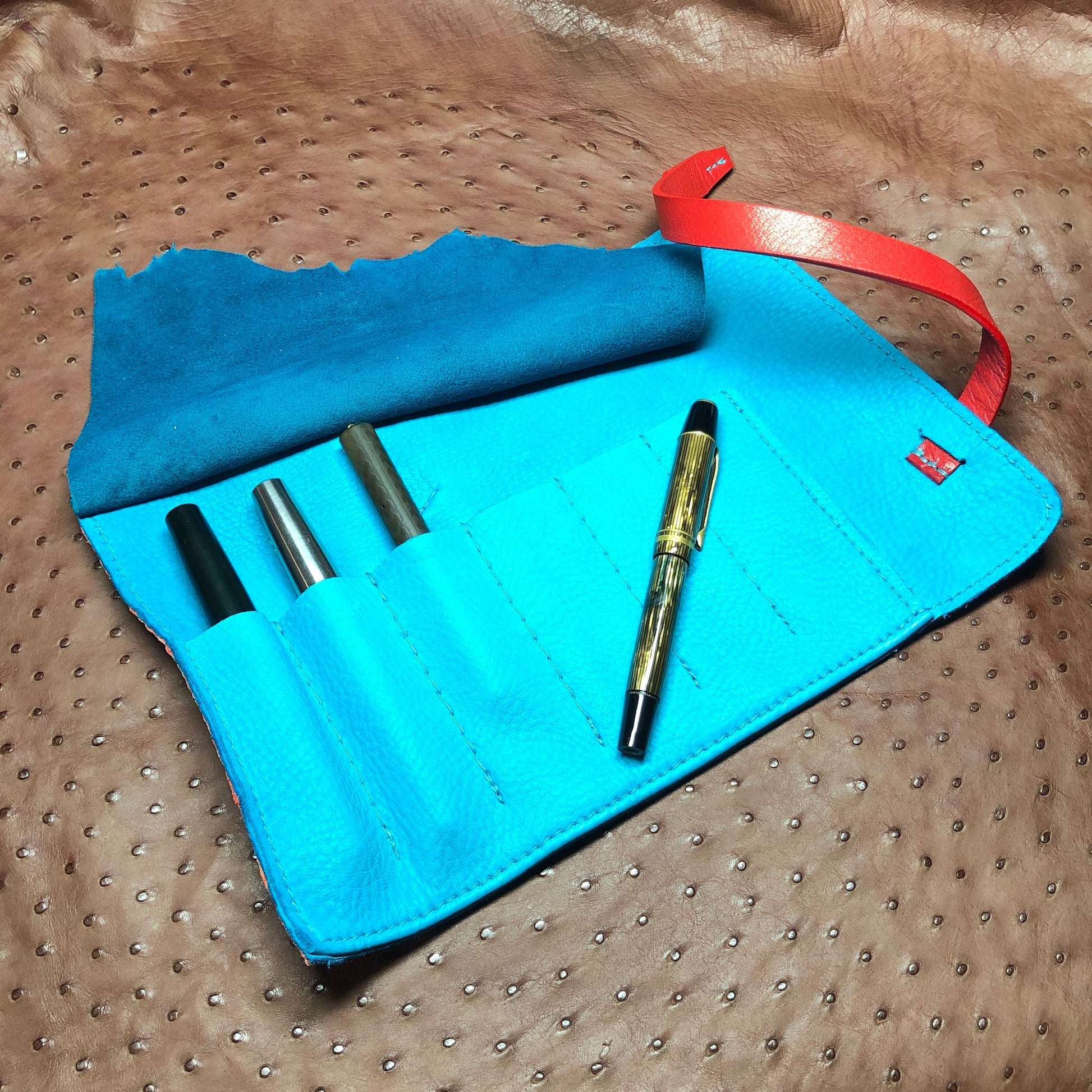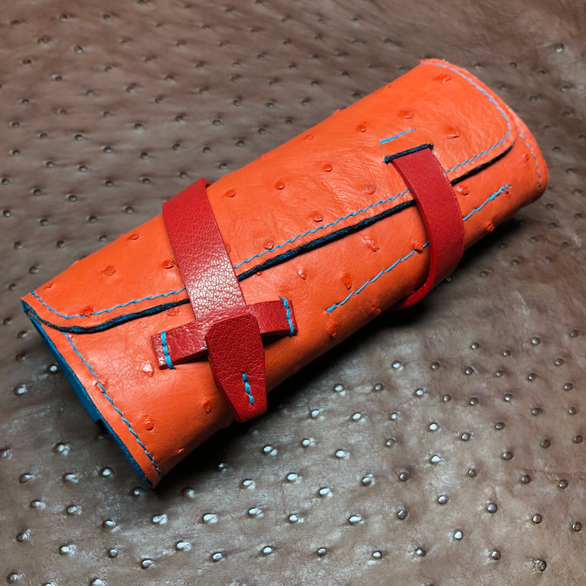 Ostrich Leather with Deerskin Lining, Pen Roll for 6 pens