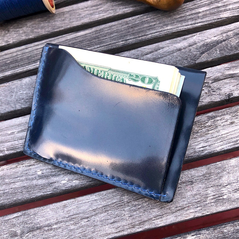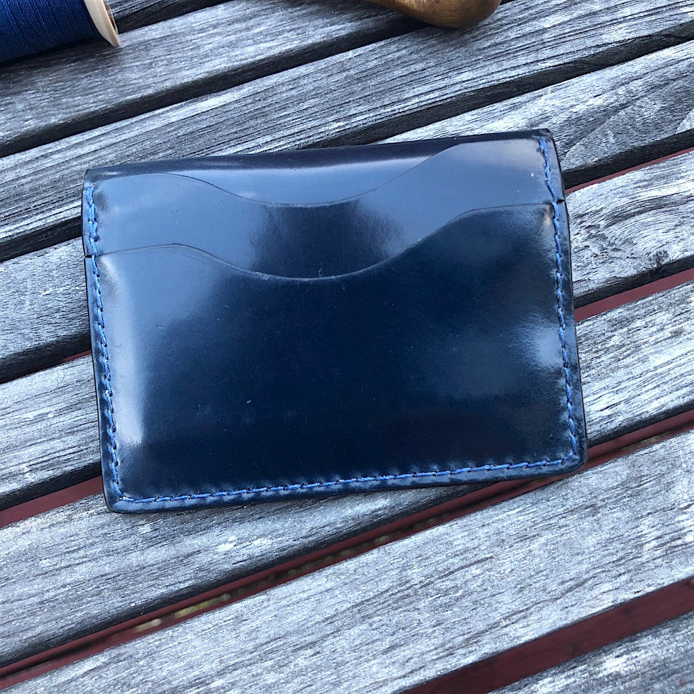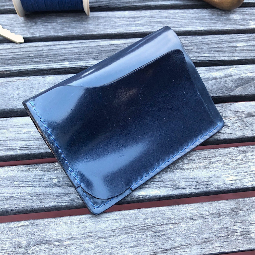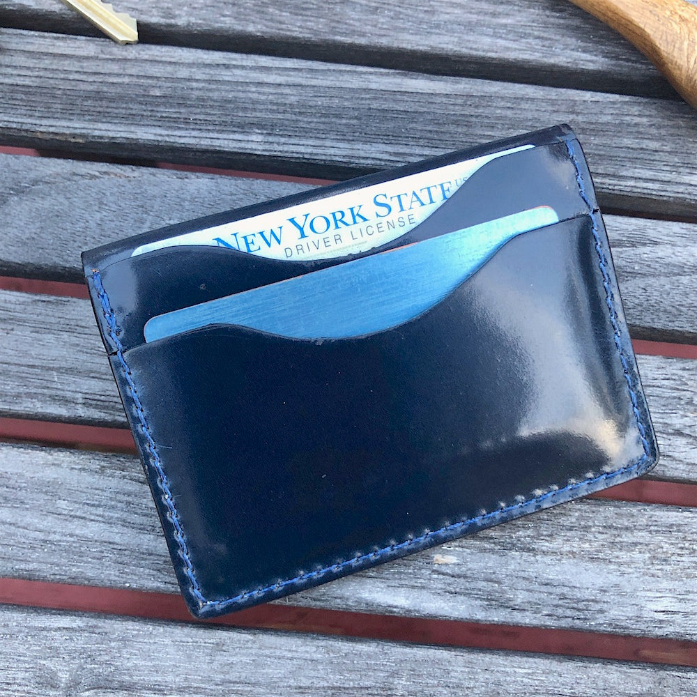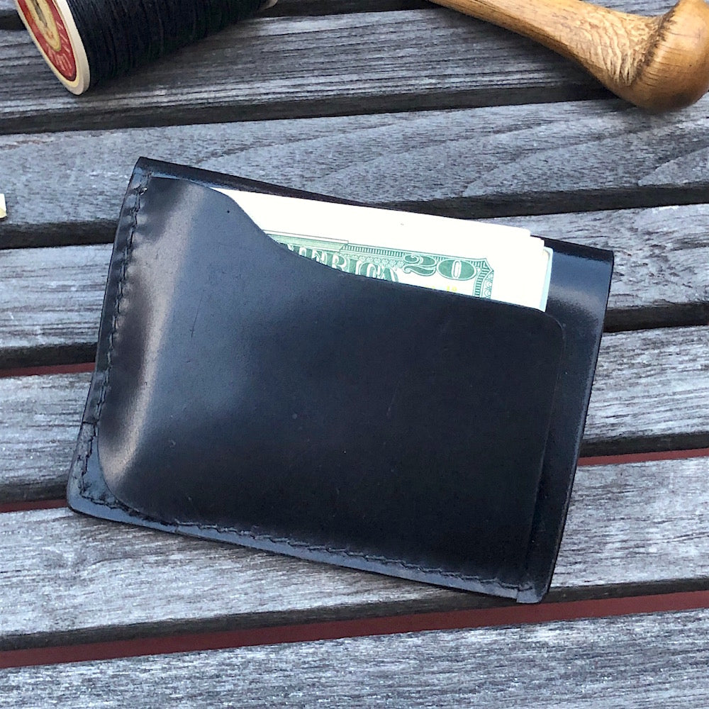 Handcrafted from vegetable dyed genuine shell cordovan leather. The edge is coated and polished. Perfect fit for any pocket, front or back, tight or loose, without bulk. It will hold credit cards, drivers license etc. in 4 compartments: 2 card pockets on front , 1 pocket for $ bills on the back and more storage in the middle to hold about 12 credit cards.