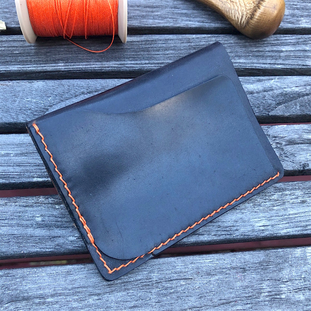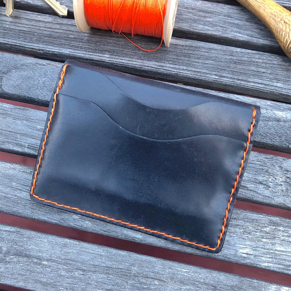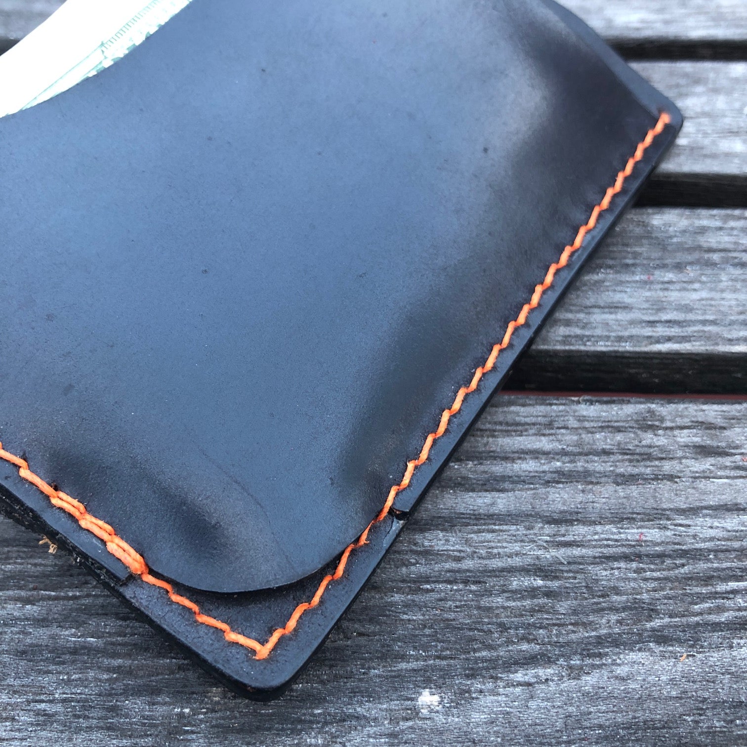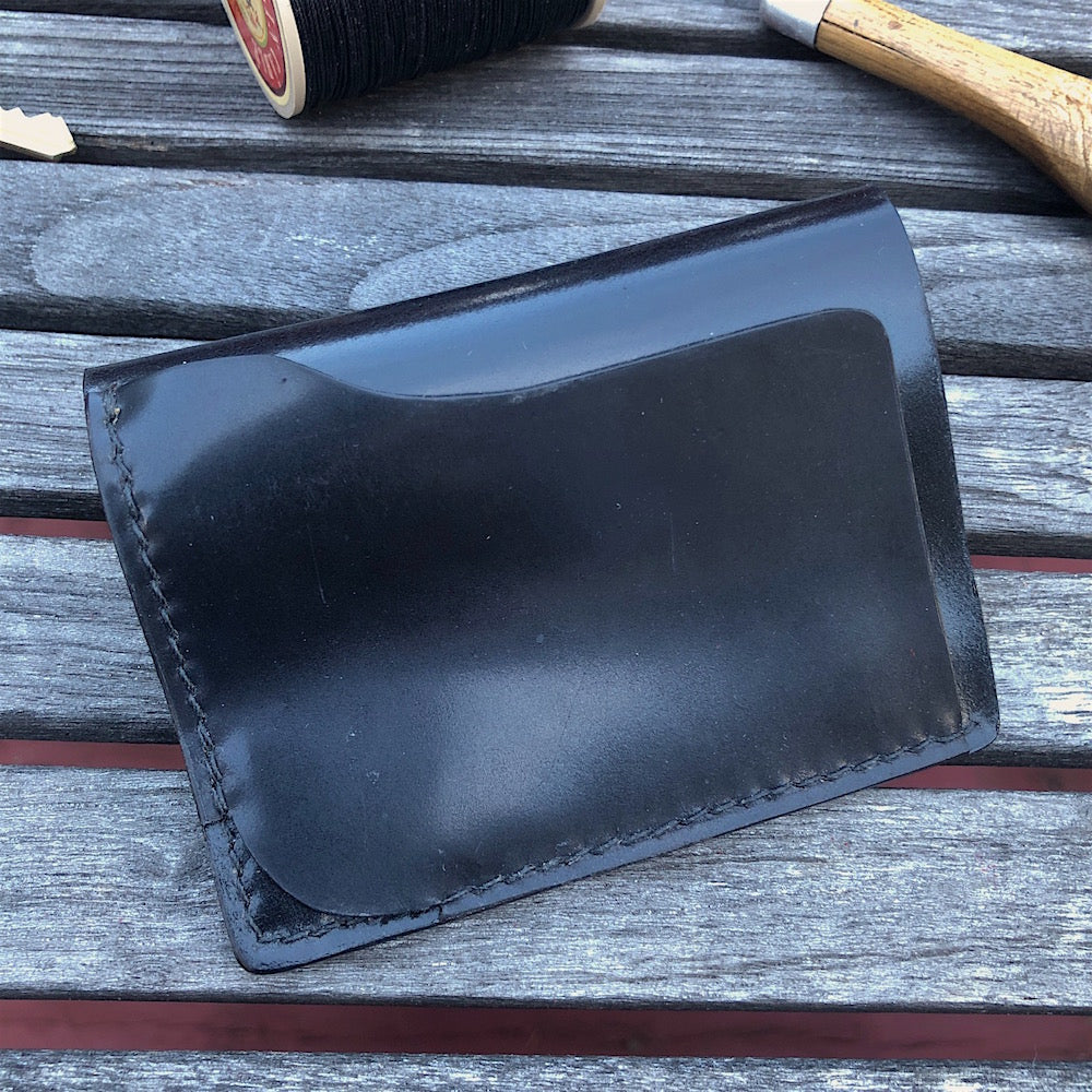 Handcrafted from vegetable dyed genuine shell cordovan leather. The edge is coated and polished. Perfect fit for any pocket, front or back, tight or loose, without bulk. It will hold credit cards, drivers license etc. in 4 compartments: 2 card pockets on front , 1 pocket for $ bills on the back and more storage in the middle to hold about 12 credit cards.
